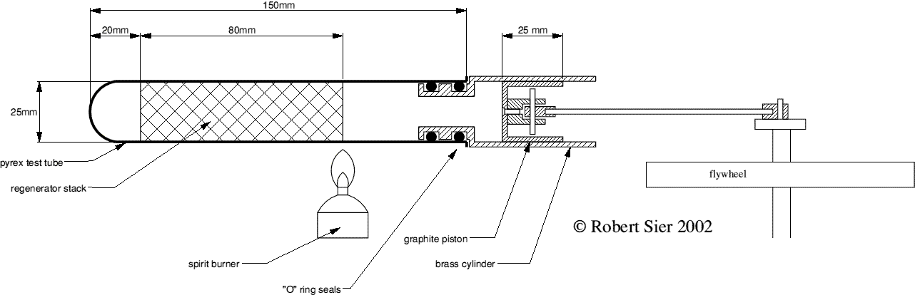 I made the stroke of the piston variable. It will be found that the power of the engine increases with the stroke, this is because larger volumes of air are pulsed through the heat exchanger.